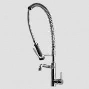 Deck-mounted, single-hole, side-lever mixer with swivel spout and pre-rinse sprayDurable, solid, low-lead brass constructionInstalls with lever on right side onlyHermetically sealed, universal ceramic disc cartridge with adjustable temperature and flow rate limitation160° swivel spoutPre-rinse spray with integrated water hammer arrestor and polymer-coated solid steel support spring- extension of work radius length 20 inch10 mm OD copper supply lines with 1/2" FPT adapterMounting hole size Ø = 1 3/8"
