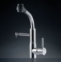 One Handle Pull-Out Spray Kitchen FaucetSystema SeriesSpout Height - 13 7/16"Spout Reach - 10"Durable, solid, low-lead brass or solid stainless steel constructioninstalls with lever on right side onlySwivel spout 160 with pull-out sprayTAC turn and clean aerator, KWC JETCLEAN technologyautomatic diverter resetpull-out length 24" Universal ceramic disc cartridge with adjustable temperature and flow rate limitation Mounting hole size = 1-3/8"VF;pw rate: 2.2 gpm@60psi