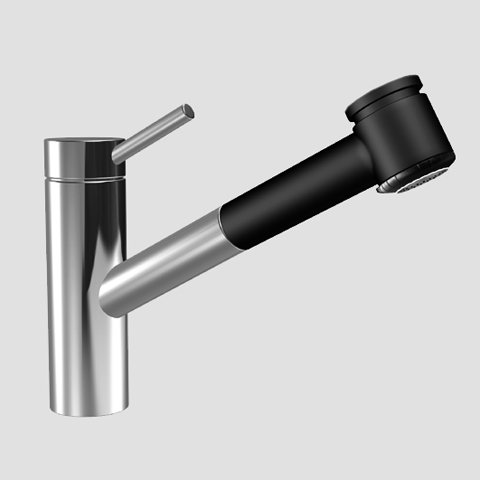 Single-hole, single lever kitchen mixer with swivel spout and pull out spray Features: Single-lever mixer Stainless steel housing and spray head ADA compliant Pull out spray Up to 27 9/16 pull-out length With lockable regular spray- This feature allows you to lock the faucets hand spray in the vegetable spray mode. Automatic diverter reset- When the faucet is turned off it will automatically divert back to regular flow mode when turned back on. Turn and Clean Feature- Allows you to remove faucets aerator by hand, to remove debris without the use of tools. Hose guide, swiveling 130 degrees Flow rate and temperature continuosly variable Specifications: 9 1/4 spout reach 81/2 from counter top to top of faucet head KWC universal cartridge with ceramic discs-temperature and flow rate limitation Flexible connection hoses 3/8 compression Mounting hole size: 1 3/8 Flow rate: 1.8 gpm 60psi . Available in the following colors: Stainless Steel, Stainless Steel/Matte Black